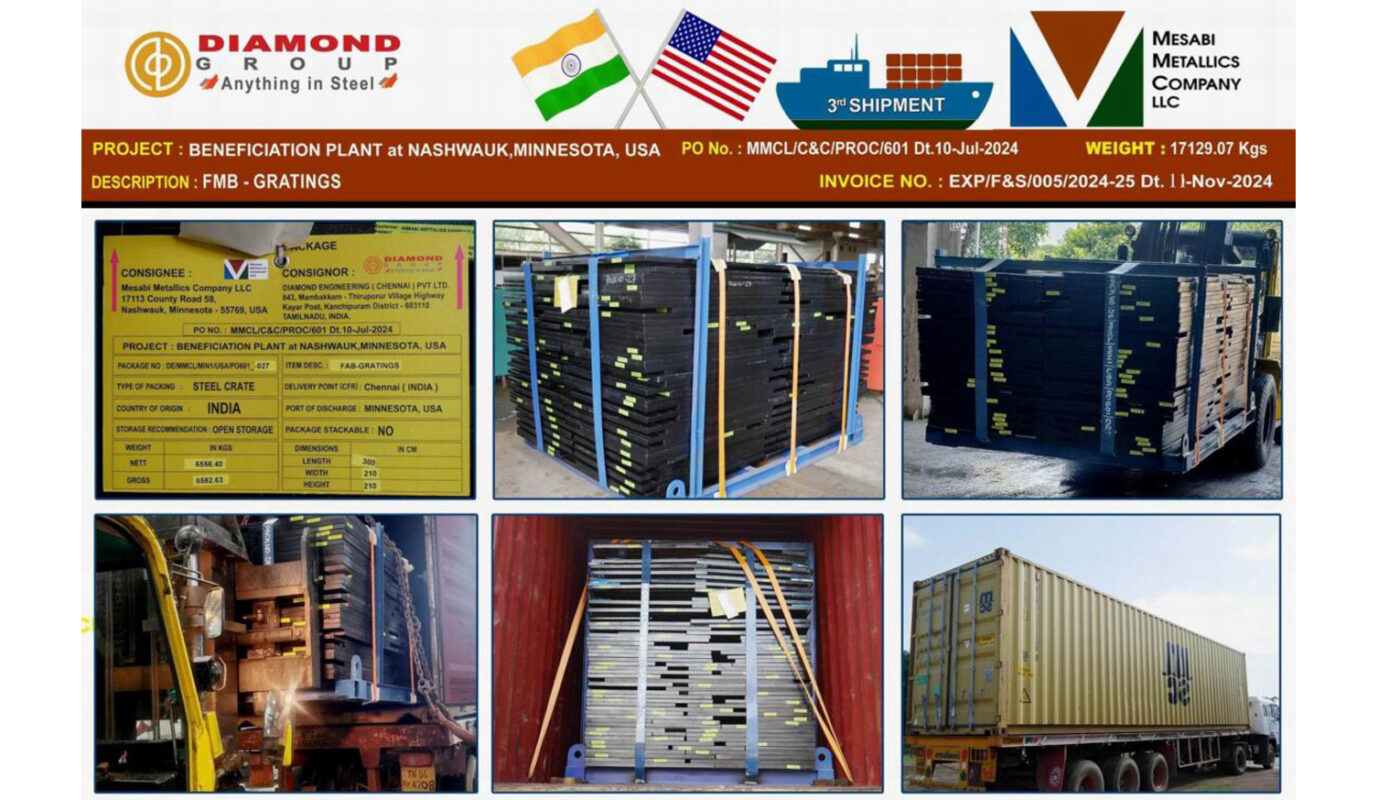 Despatches Mesabi Metallics Company LLC_ Beneficiation Plant at Nashwauk Minnesota , USA Fabricated Structural Steel for Induration Building & Balling Building – 1st Shipment Container Despatch Posted on December 11, 2024December 11, 2024 by diamond 11 Dec Continue reading →