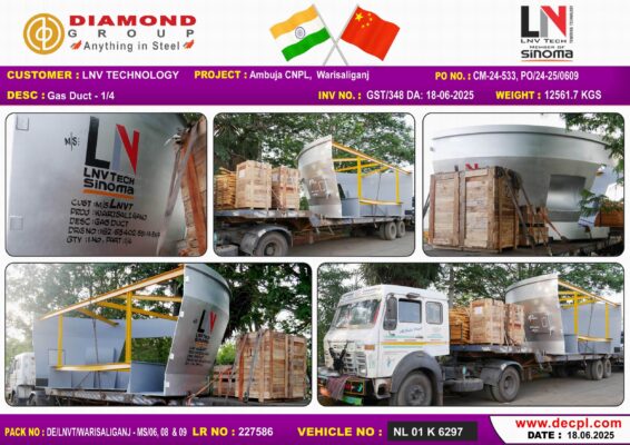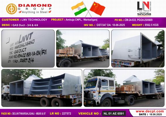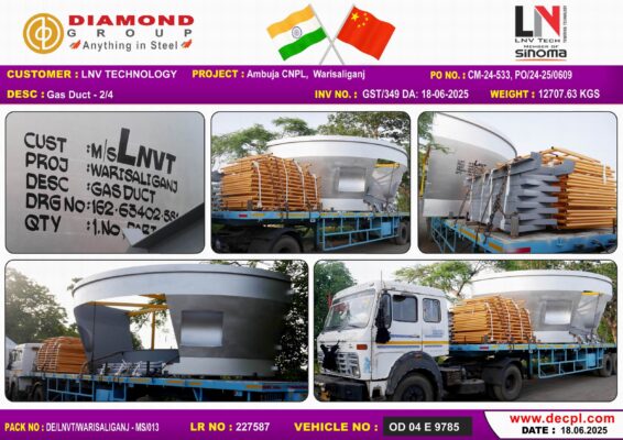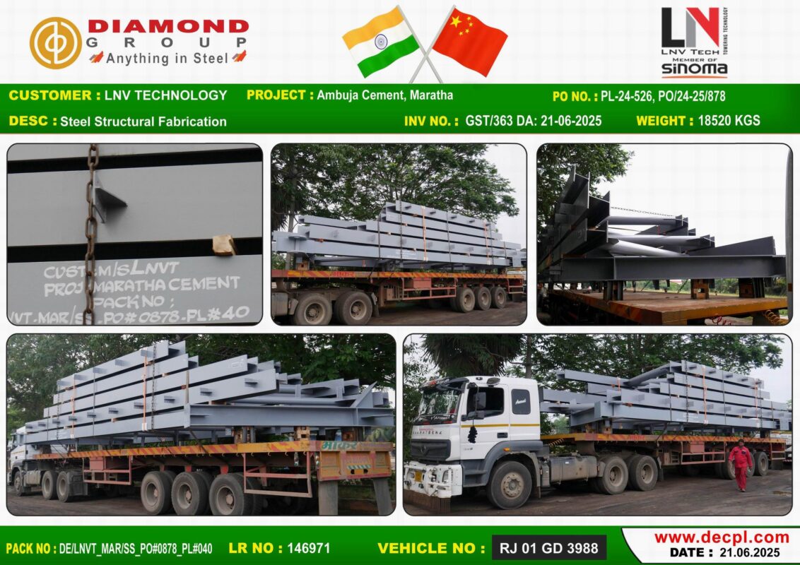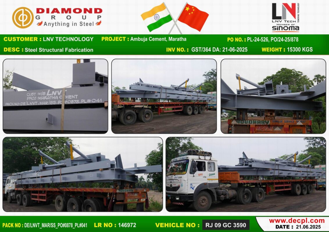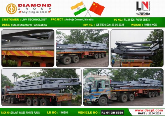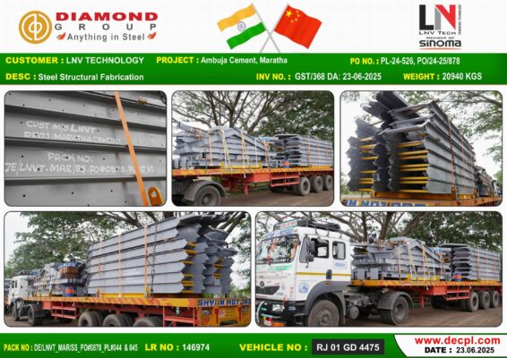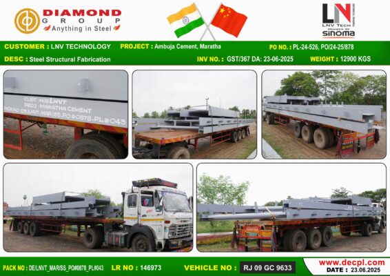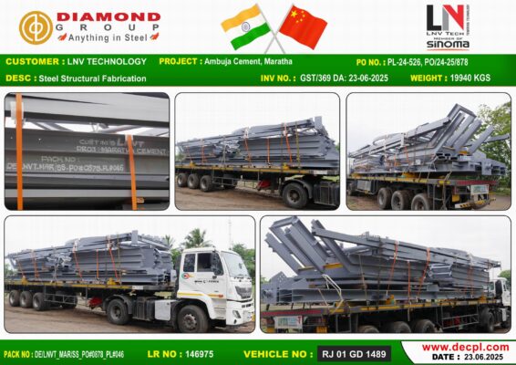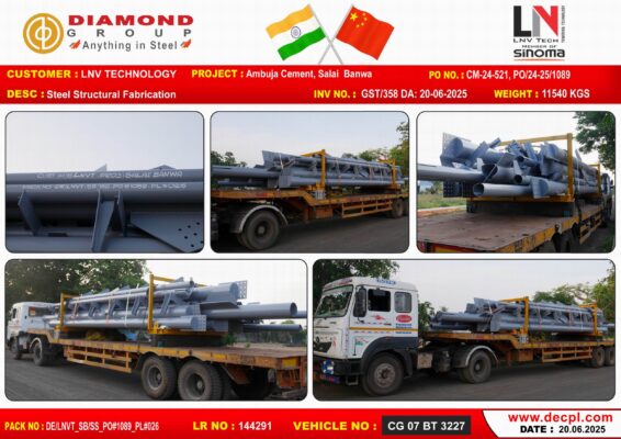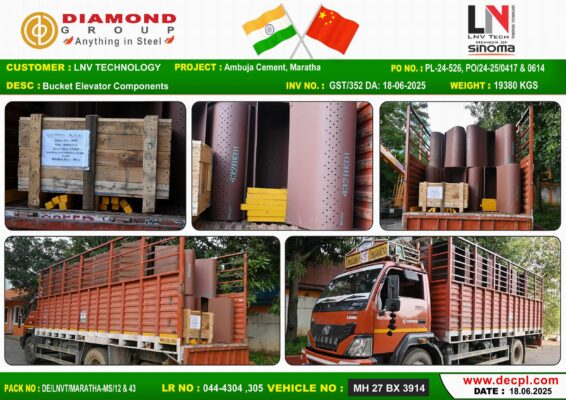 Despatches NV Technology Ambuja Cement Limited – Maratha Cement, Salai Banwa & Warisaiganj _ Steel Structural Fabrication, Bucket Elevator Components , Gas Duct Despatch Posted on June 25, 2025June 25, 2025 by diamond 25 Jun diamond Customer Site – Beumer Group – Jindal Paradip Port Ltd. – Stacker Cum Reclaimer 1st & 2nd Machine Under Erection on 21st June 2025 Zamil Steel – L&T Toyota _ Box Column & H-Section Despatch